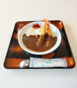 濃厚なカレーに糸魚川産コシヒカリ、そこに大きなエビフライが2個