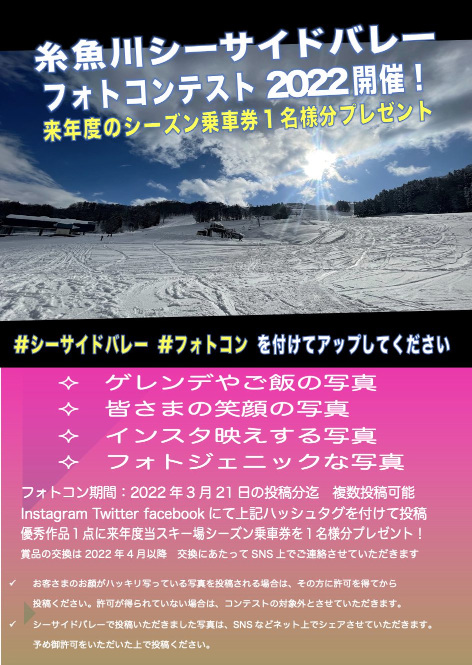 シーズン始まって、少し時間が経過してしまいましたが、シーサイドバレースキー場でもフォトコンテストを開催することになりました。