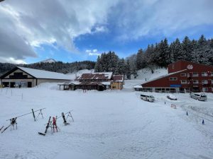 本日スキー場は曇ときどき雪となっております。寒気流入に伴う筋状の雲が、まだ少し残っている影響で、時々雪が降りますが、長い時間降ることはないでしょう。今朝ほどは写真の通り青空も見ることが出来ました!